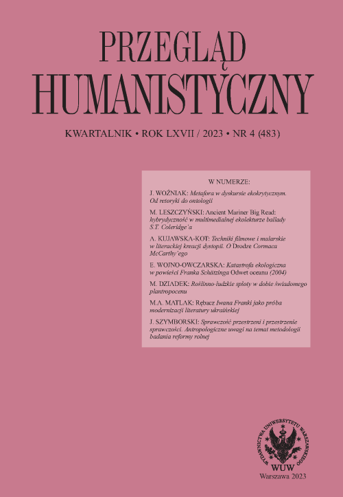 The main theme of the issue is ecology in its broadest sense. This subject matter is considered from various theoretical perspectives: sociological, philosophical, those of literary and film studies. The research material used by the Authors is also chronologically diverse, covering works and phenomena from the turn of the 18th and 19th centuries to the first decades of the present century, predominantly representing the Anglo-Saxon culture.